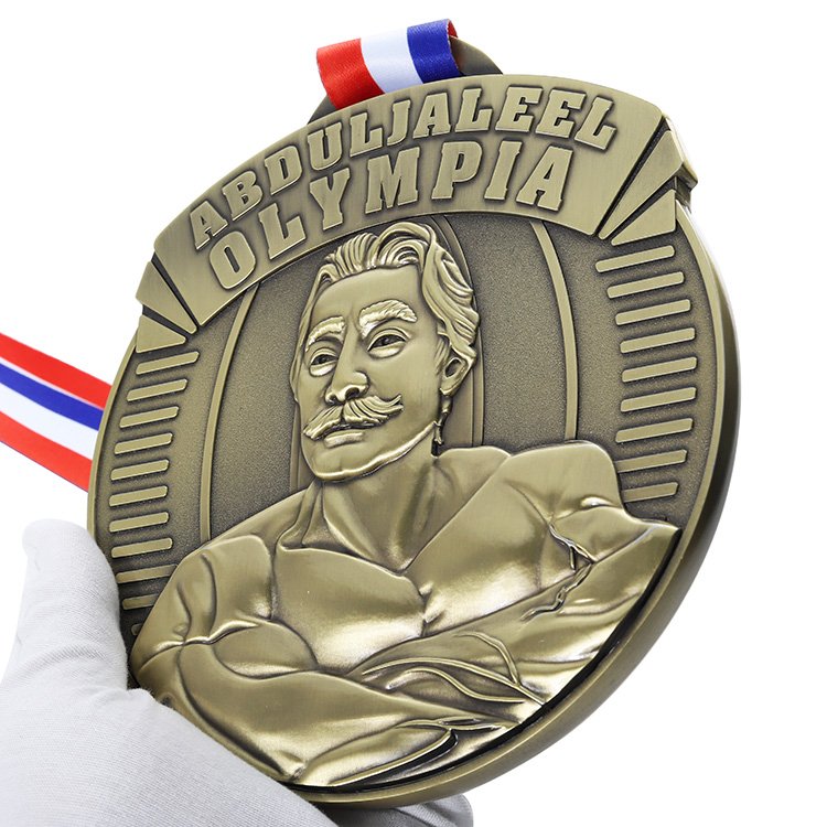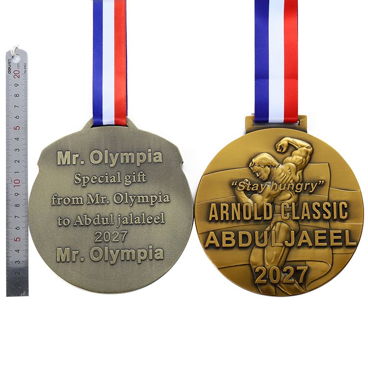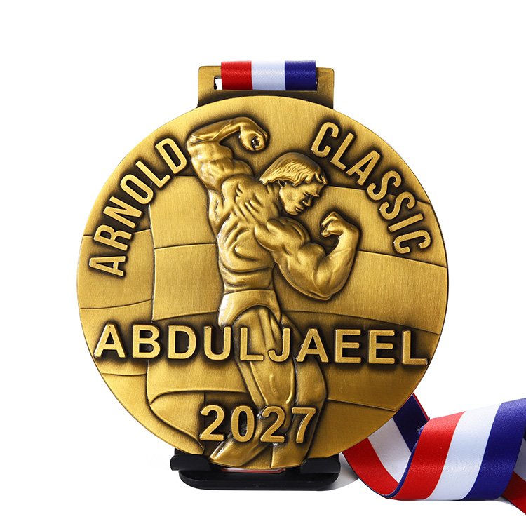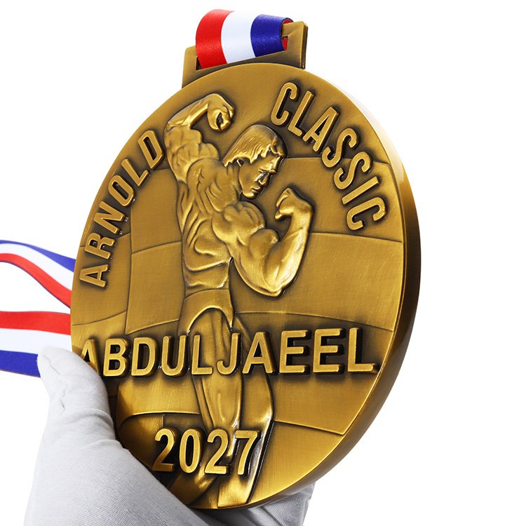 Bodybuilding medal 100% Customized design, zinc alloy material, custom 3d medal, gold plated metal color, soft enamel logo on front side, 5 inch size with 5mm thickness, attached with 35 inch x1.5 inch sublimation printed ribbon lanyard.