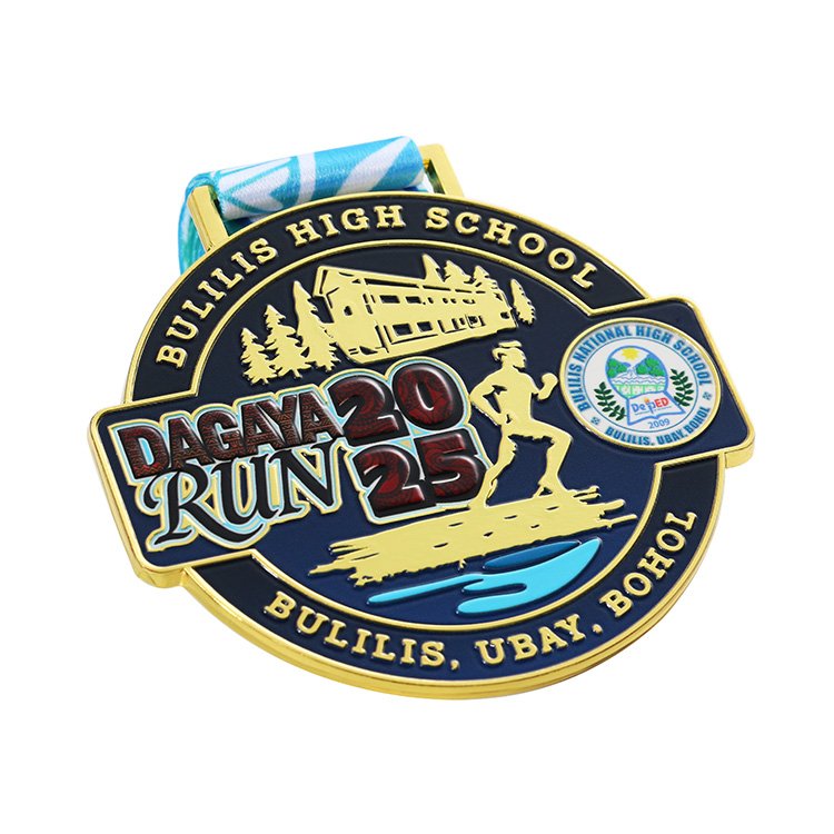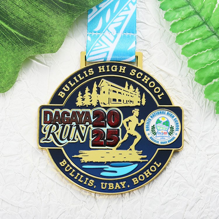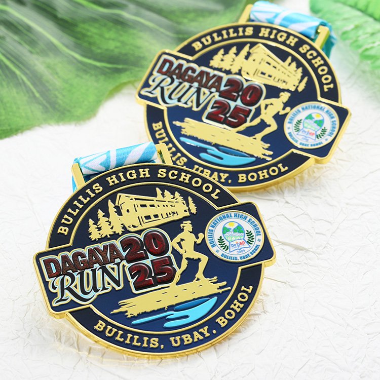 Running Medal 100% Customized design, zinc alloy material, custom 3d medal, gold plated metal color, UV Printing design on front side, 3 inch size with 3mm thickness, attached with 35 inch x1.25 inch sublimation printed ribbon lanyard.
